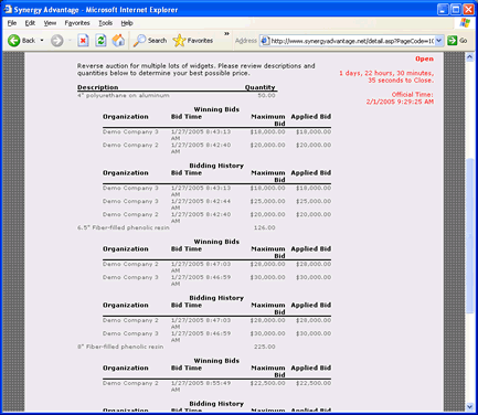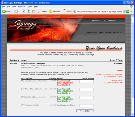 Once the auction is open, your suppliers can start the bidding process. Bidding is easy. The suppliers simply type in the amount they would like to bid and click the Place Bid button.