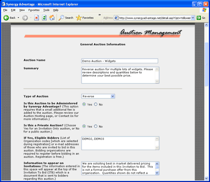Prior to the auction opening, you will receive a Paypal notice for payment for the amount of $250 per auction. This fee is a flat fee and is not contingent on the size of the auction, the money involved, or the number of bidders invited. For an additional $250, Synergy Advantage will administer your auction, generate invitations, and provide technical support to your suppliers immediately prior to, and during, the time the auction is open.